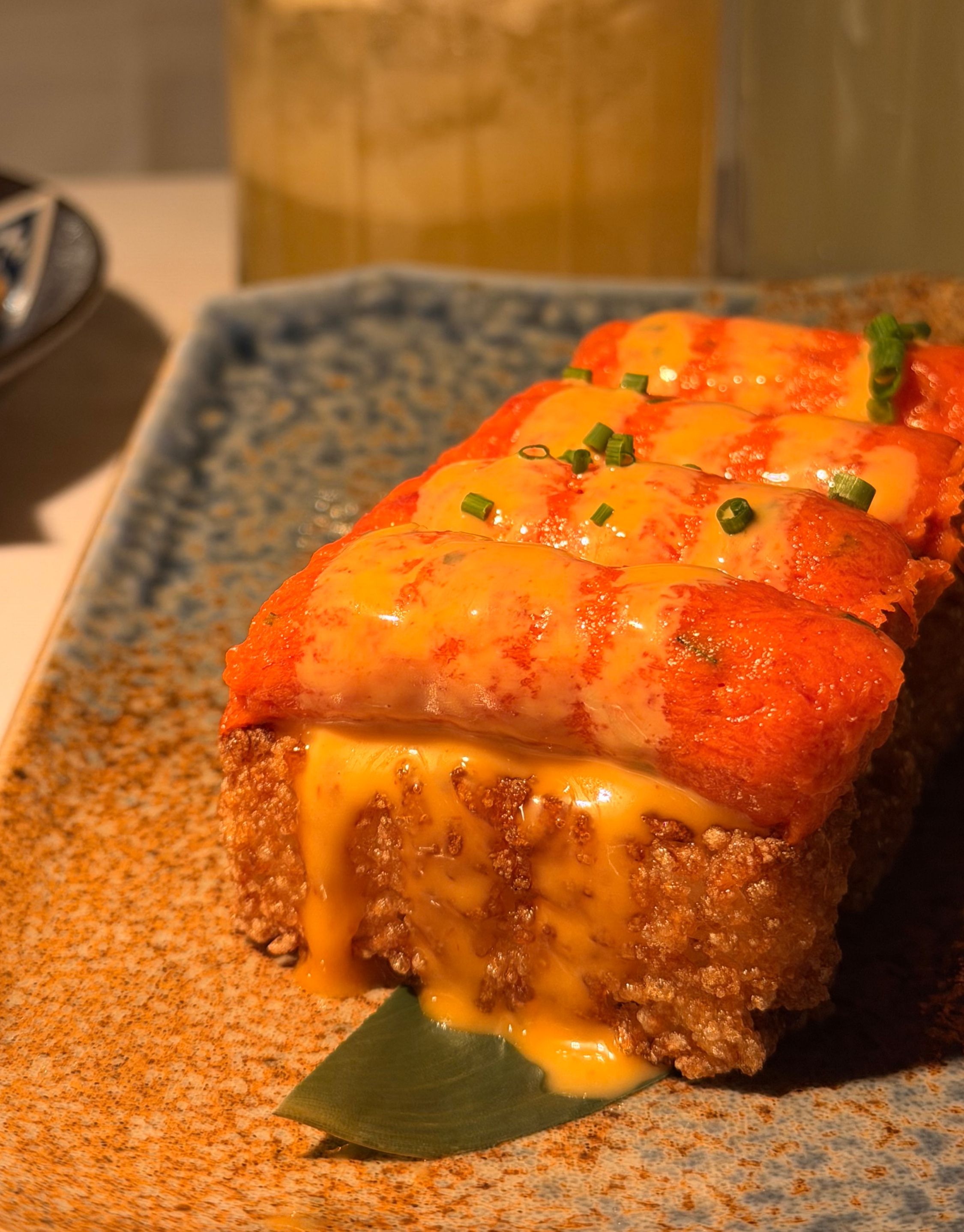 The Spicy Tuna Crispy Rice ($27) is an instant standout — big eye tuna, sriracha mayo, and sesame oil on crispy rice. It's the kind of dish that disappears fast, so order it early. The Yellowtail Sashimi ($25) with black garlic and crispy ginger is simple and clean, letting the quality of the fish speak for itself. And if you're feeling indulgent, the Lobster Spoons ($27 for four) are poached lobster in a beurre blanc butter sauce that's genuinely hard to stop eating.