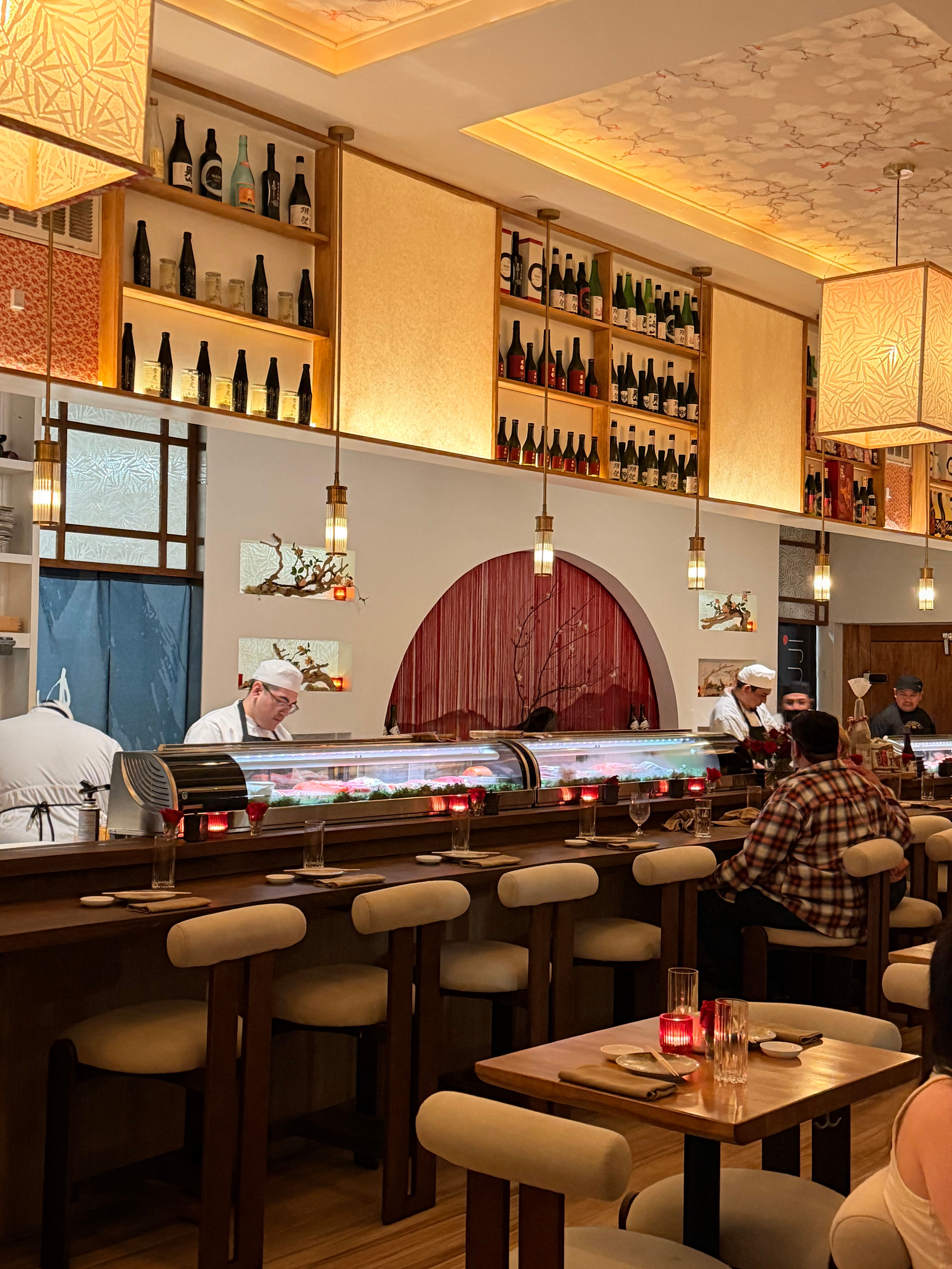The interior is genuinely beautiful — warm, dim lighting, a showstopping circular bar at the center of the room, cherry blossom details overhead, and big windows that make the space feel open and airy earlier in the evening. It's the kind of place that feels special without being stuffy. The energy is lively but not overwhelming, and the outdoor patio adds a whole other dimension in good weather.