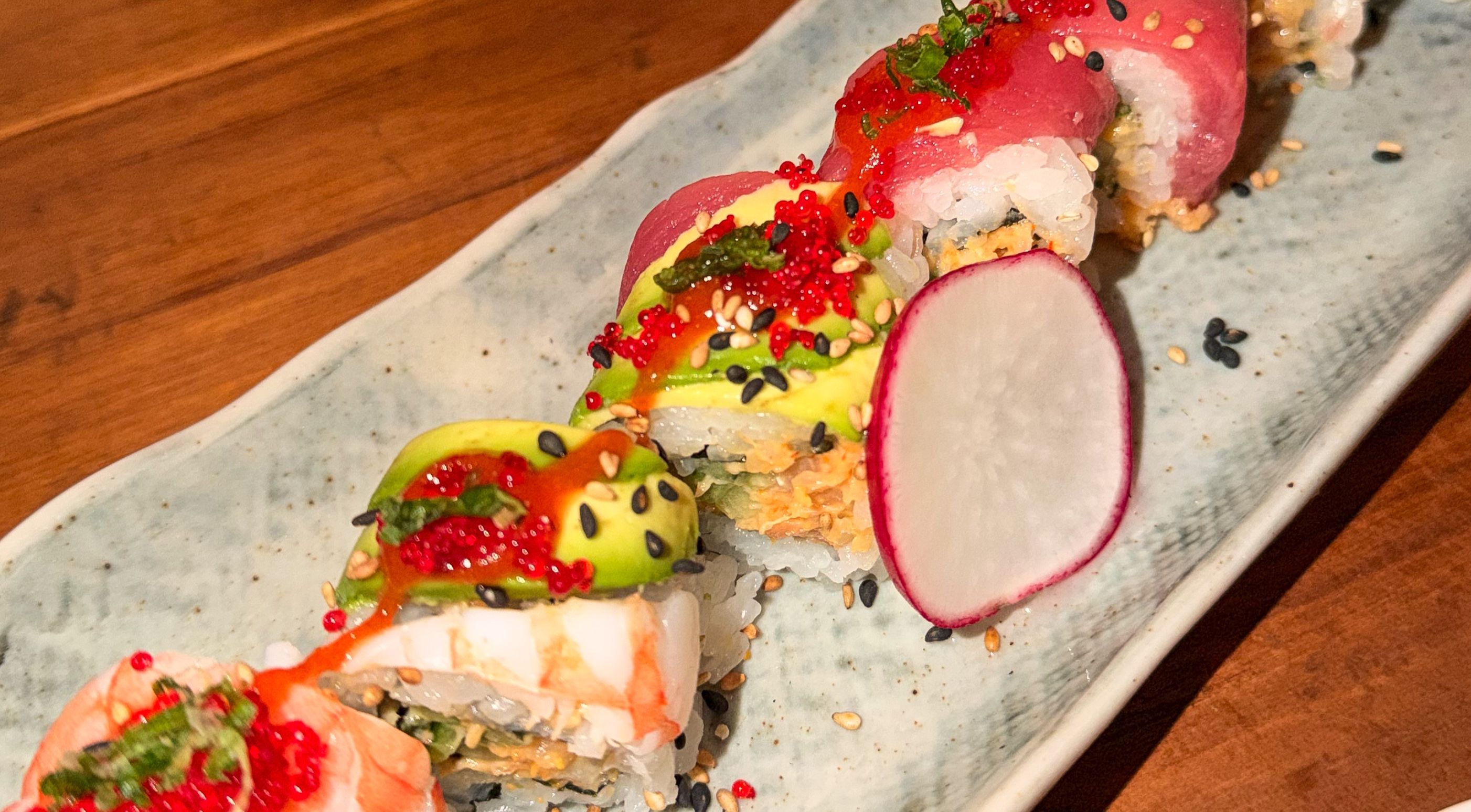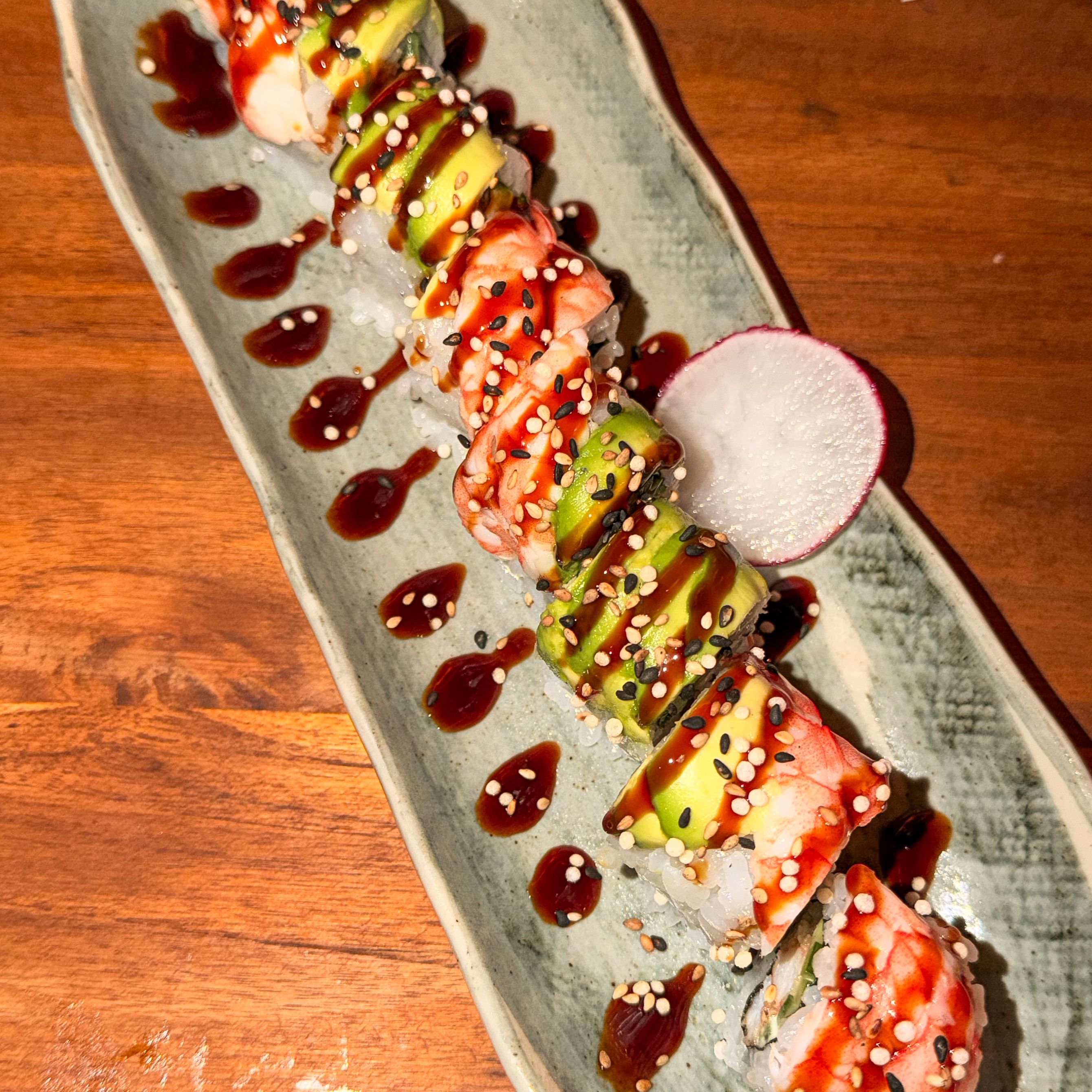A classic combination done really well. The sweetness of the eel sauce plays perfectly off the shrimp, and the texture contrast between the crispy elements and the rice is spot on. Comfort food in sushi form.